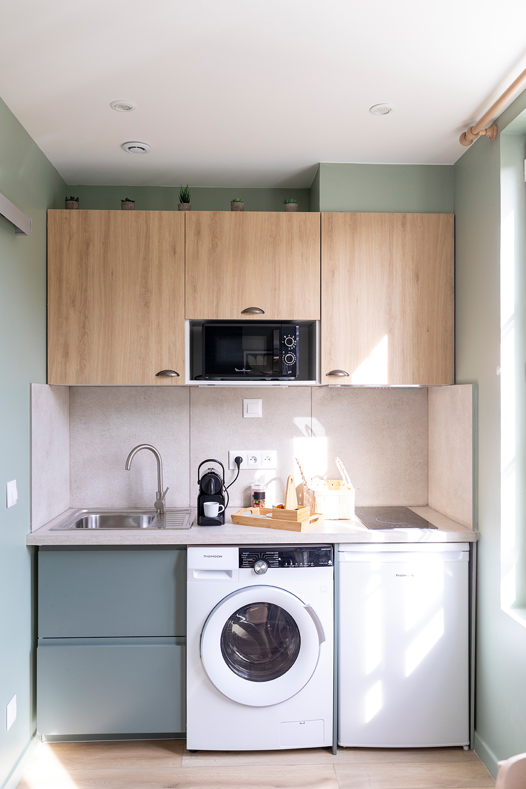 une cuisine entièrement équipée, une salle d’eau privative, un coin bureau.